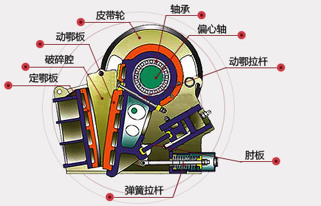 颚式破碎机破碎方式为曲动挤压型,运作原理主要模拟动物的两颚运动。工作时,电动机驱动皮带和皮带轮,通过偏心轴使动颚上下运动,当动颚上升时,肘板和动颚间夹角变大,从而推动动颚板向定颚板接近,物料通过两颚板之间的挤压、搓、碾等实现多重破碎;当动颚下行时,肘板和动颚间夹角变小,动颚板在拉杆、弹簧的作用下离开定颚板,已破碎物料在重力的作用下,经颚腔下部的出料口自由卸出。随着电动机的连续转动,动颚做周期性的压碎和排料,实现批量生产。
