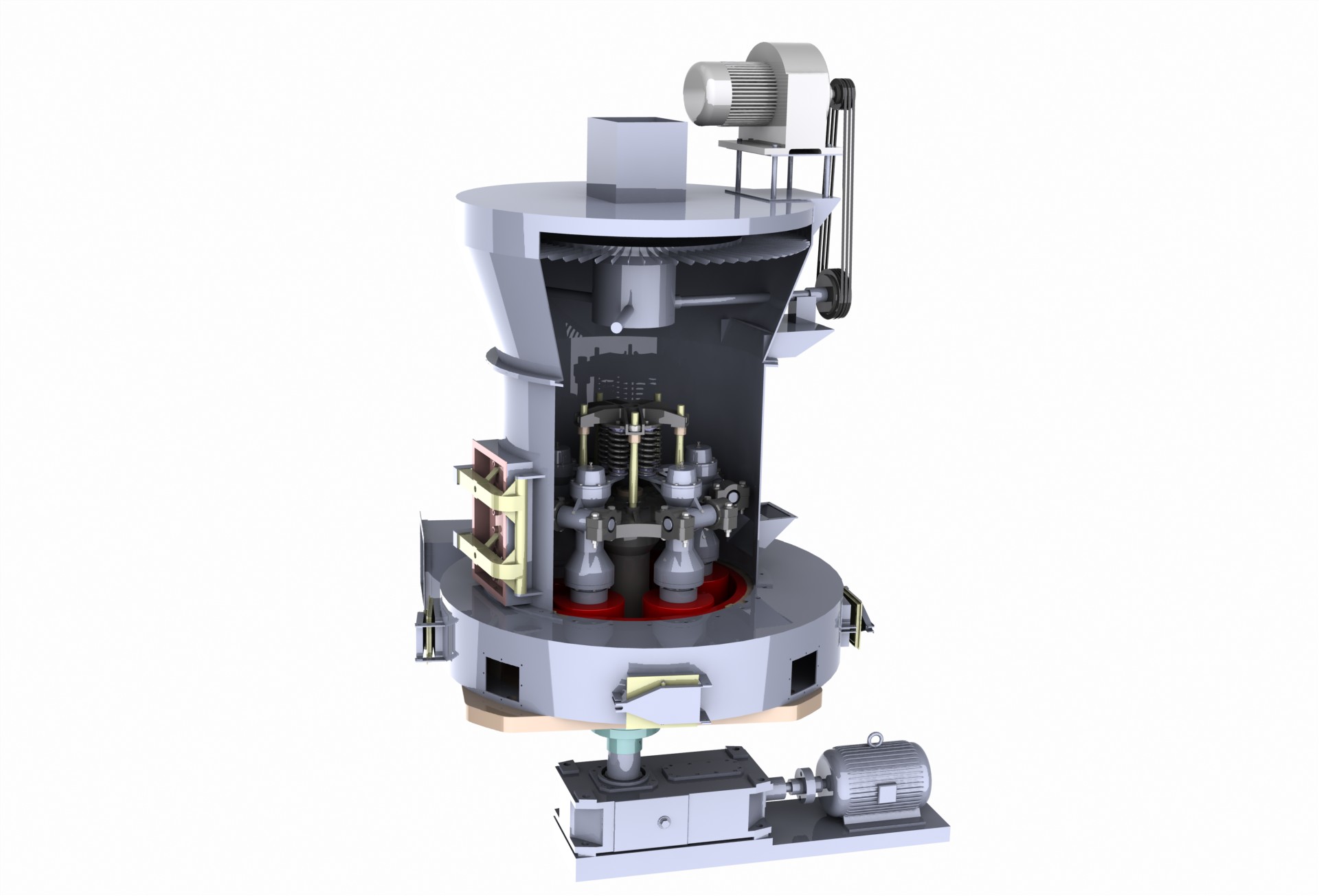 开始工作后,磨辊围绕主轴旋转,并在高压弹簧与离心力的作用下,紧贴